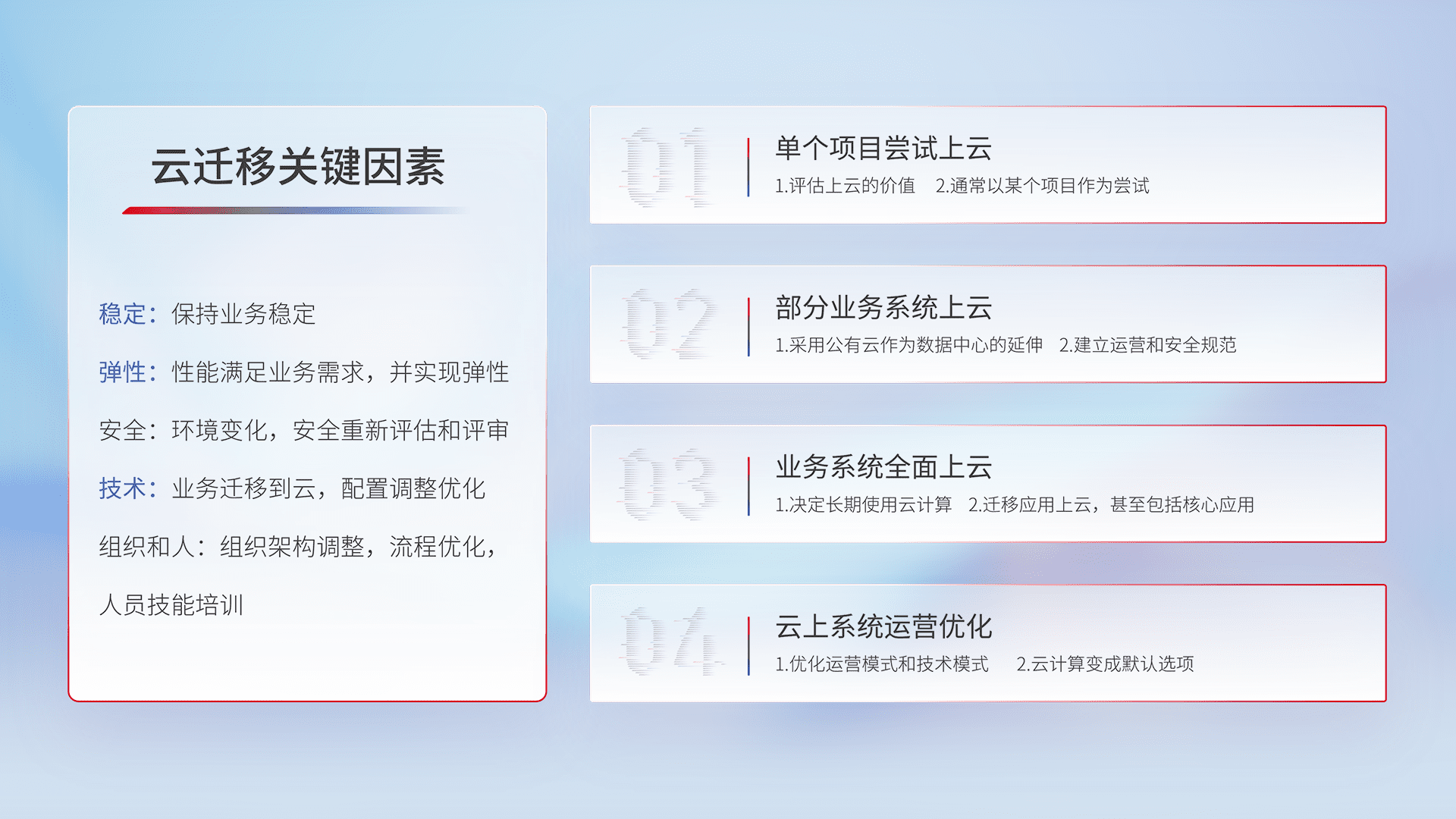 结合实际业务,,,从规划设计、、、云平台选型、、云原生改造、、、、数据迁移、、集成交付,,迁移全过程为客户识别最佳上云路径,,,,做好风险识别管理,,设计网络架构、、、、身份权限、、、、安全审计合规、、、操作审计、、、日志审计、、、、监控告警策略、、多站点容灾设计等,,,对云上基础设施进行整体规划,,提升IT治理水平,,,,以满足弹性、、、、高可用、、、、高性能的需求。。。。